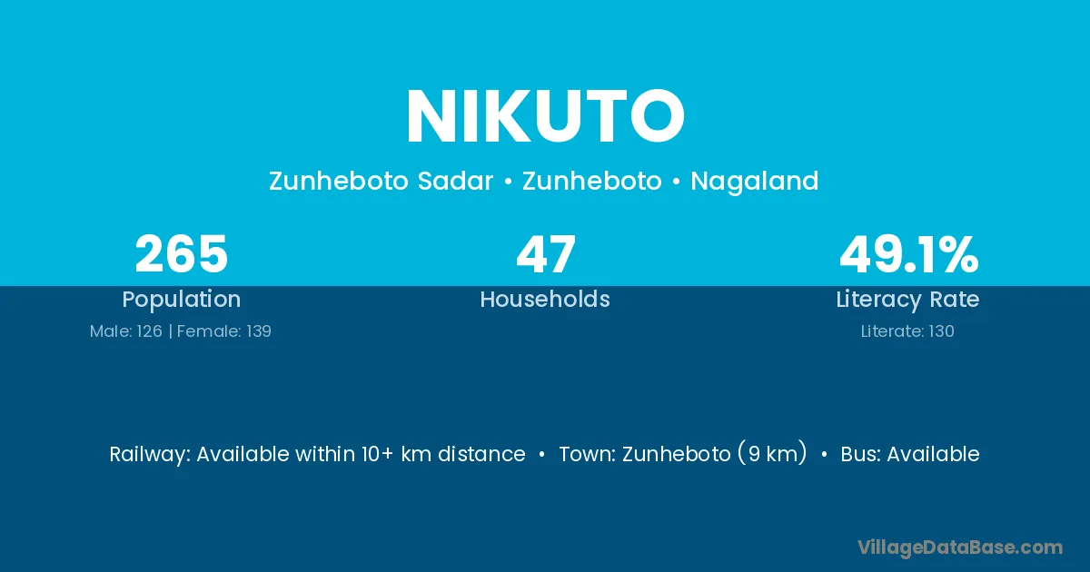 Zunheboto (9 km) is the nearest town to Nikuto village for major economic activities and is located approximately 9 km away.