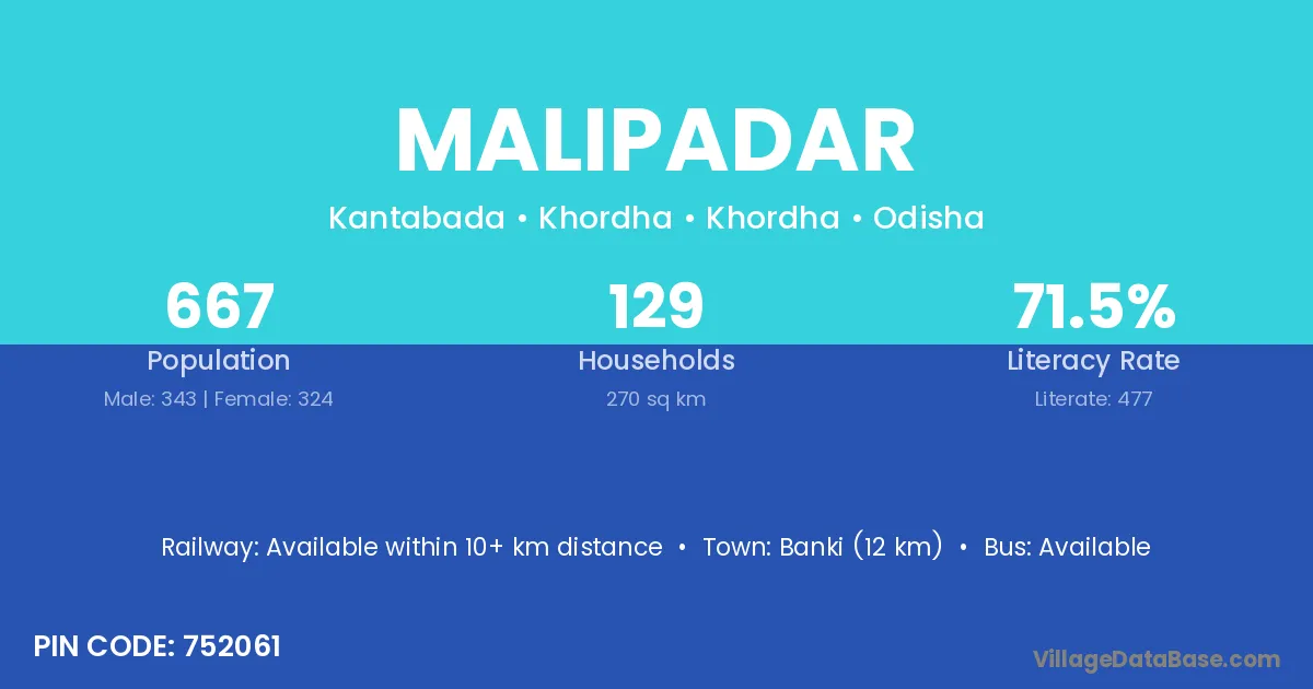 The literacy rate of Malipadar village is 72.64%. Male literacy stands at 82.57% and female literacy at 62.00%.