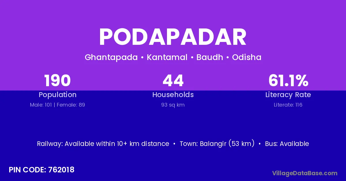 Athamallik (15 km) is the nearest town to Podapadar village for major economic activities and is located approximately 15 km away.