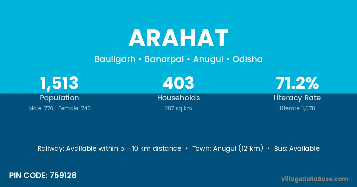 Anugul (12 km) is the nearest town to Arahat village for major economic activities and is located approximately 12 km away.