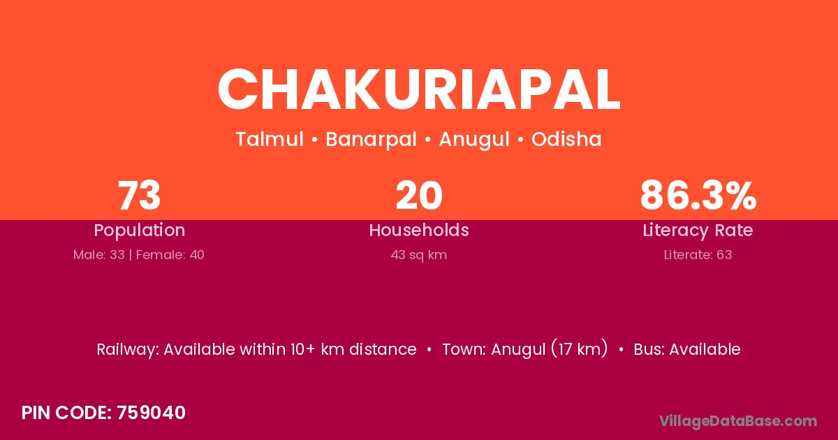 Anugul (17 km) is the nearest town to Chakuriapal village for major economic activities and is located approximately 17 km away.