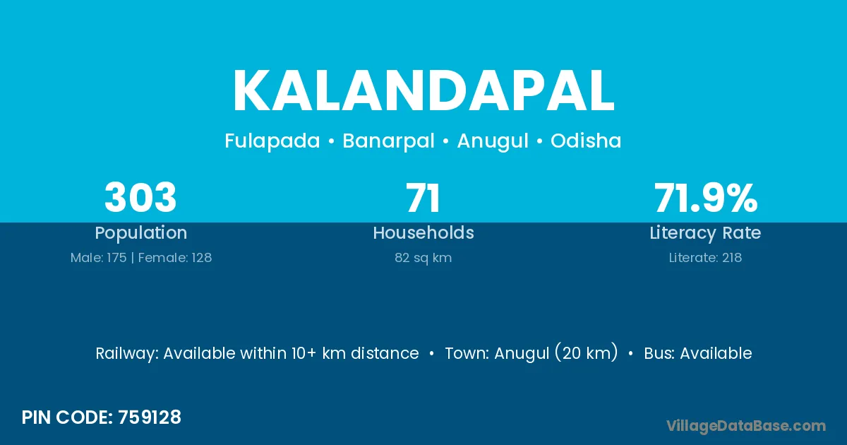 Anugul (20 km) is the nearest town to Kalandapal village for major economic activities and is located approximately 20 km away.