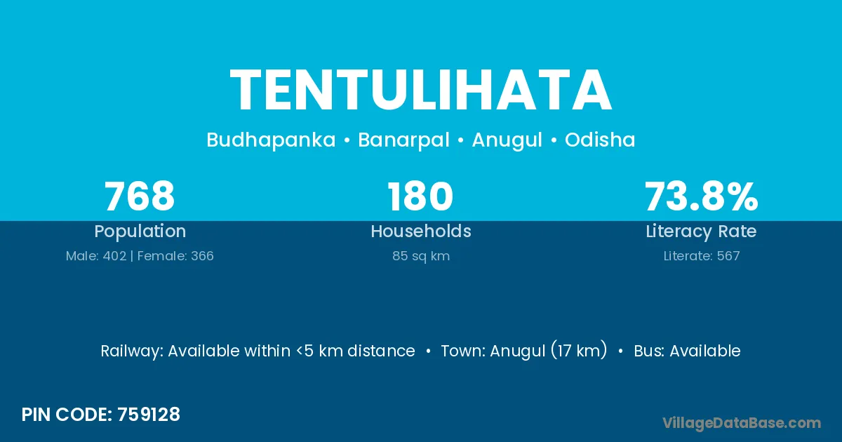 Anugul (17 km) is the nearest town to Tentulihata village for major economic activities and is located approximately 17 km away.