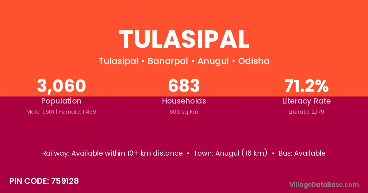 Anugul (16 km) is the nearest town to Tulasipal village for major economic activities and is located approximately 16 km away.