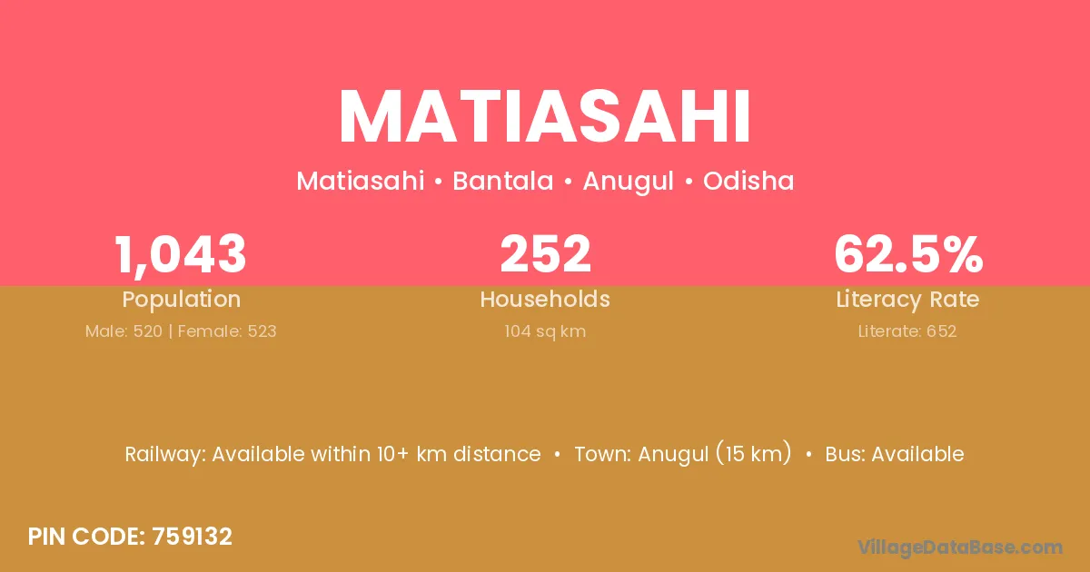 Anugul (15 km) is the nearest town to Matiasahi village for major economic activities and is located approximately 15 km away.