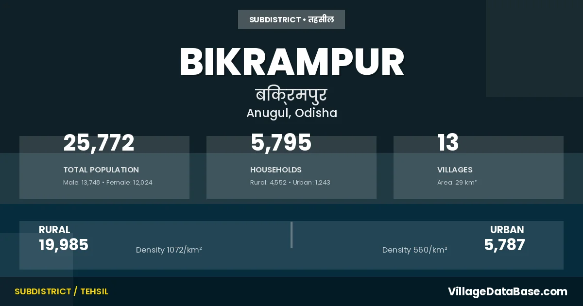Bikrampur is a town and Tehsil in the Anugul district of the Odisha. In India, a Tehsil is a subdivision of a district responsible for the administration and revenue collection of a specific area within the district. Tehsils play a crucial role in the local governance structure, contributing significantly to the development and administration of their communities.
