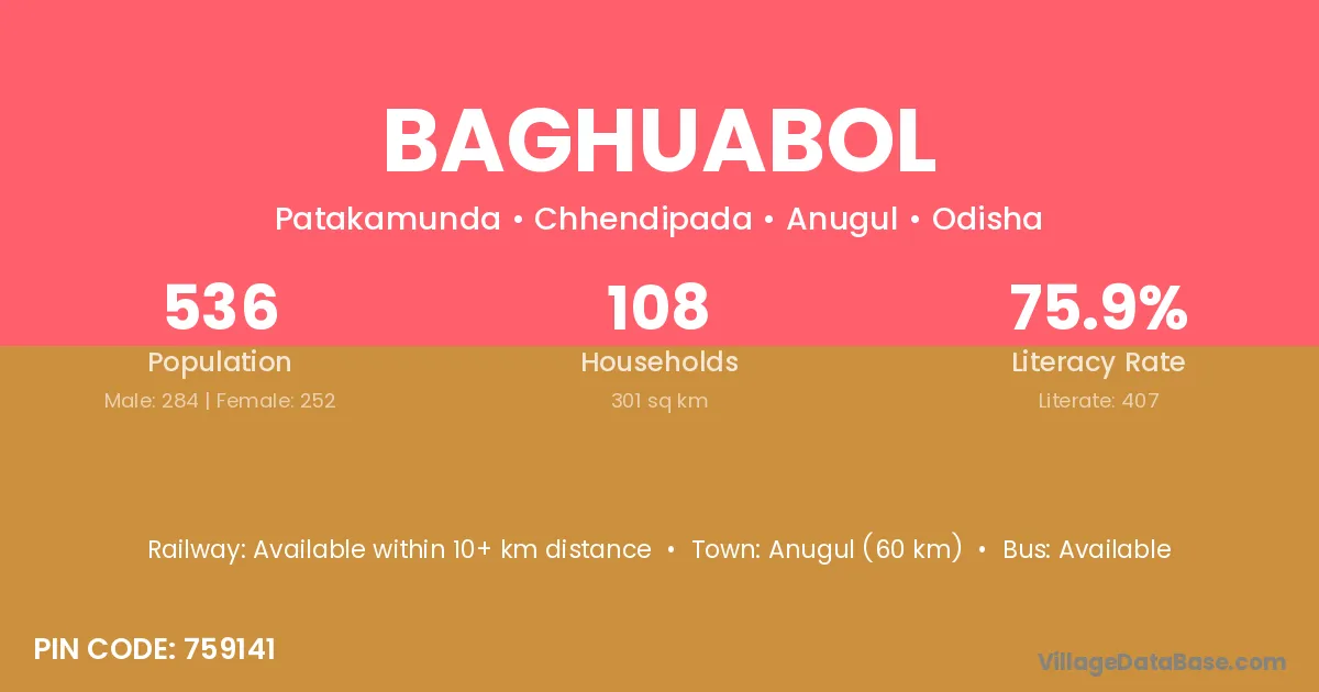 Anugul (60 km) is the nearest town to Baghuabol village for major economic activities and is located approximately 60 km away.