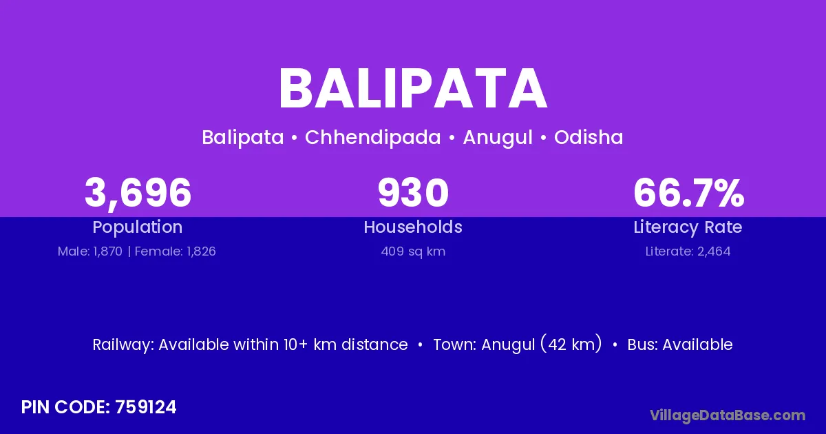 Balipata village has a total population of 3,696 people, of which 1,870 are males and 1,826 are females.