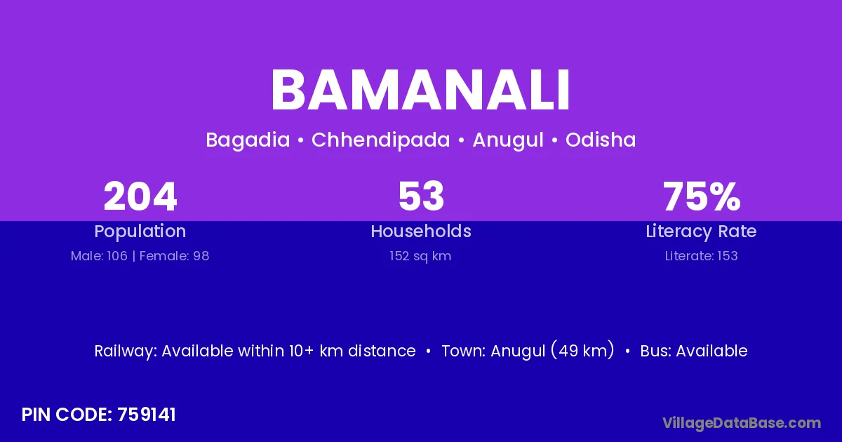 Anugul (49 km) is the nearest town to Bamanali village for major economic activities and is located approximately 49 km away.