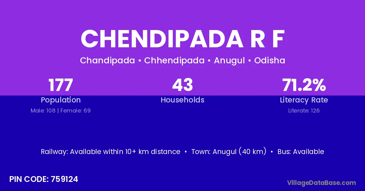 Anugul (40 km) is the nearest town to Chendipada R F village for major economic activities and is located approximately 40 km away.