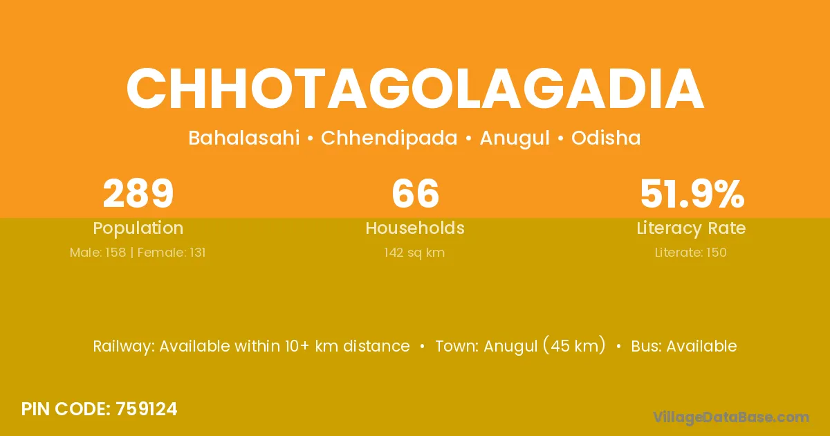 Anugul (45 km) is the nearest town to Chhotagolagadia village for major economic activities and is located approximately 45 km away.