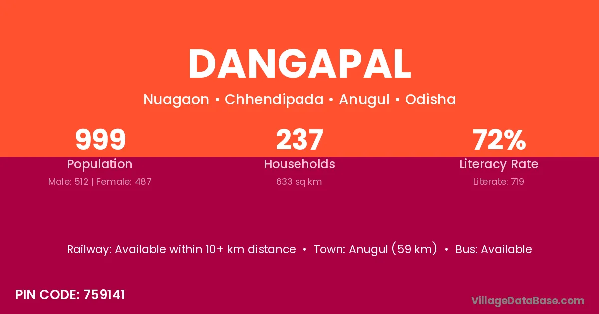 Anugul (59 km) is the nearest town to Dangapal village for major economic activities and is located approximately 59 km away.