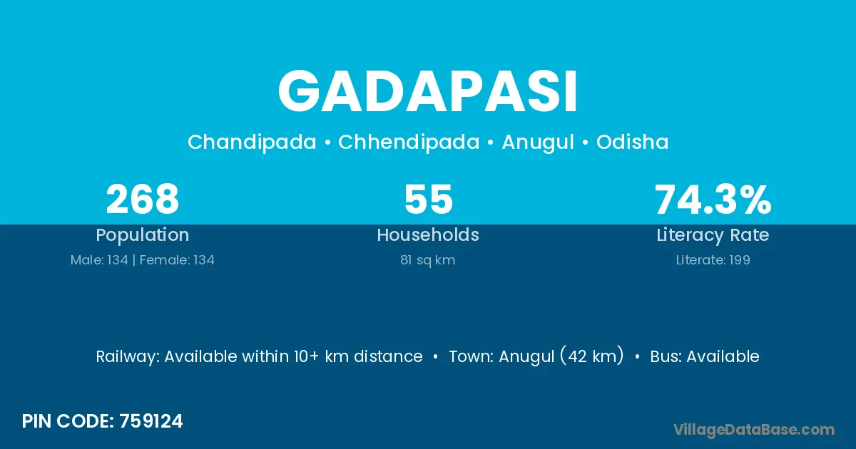 Anugul (42 km) is the nearest town to Gadapasi village for major economic activities and is located approximately 42 km away.