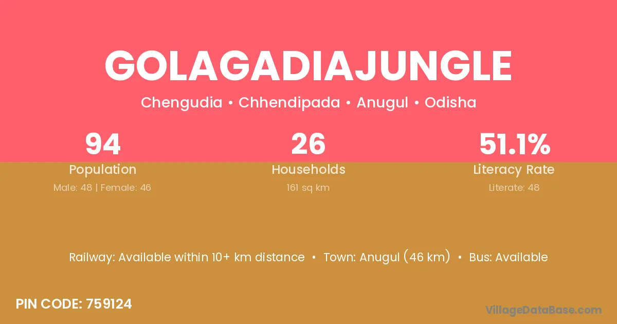 Golagadiajungle village has a total population of 94 people, of which 48 are males and 46 are females.