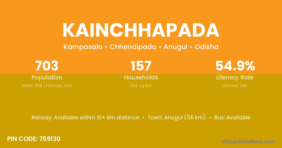 Anugul (56 km) is the nearest town to Kainchhapada village for major economic activities and is located approximately 56 km away.