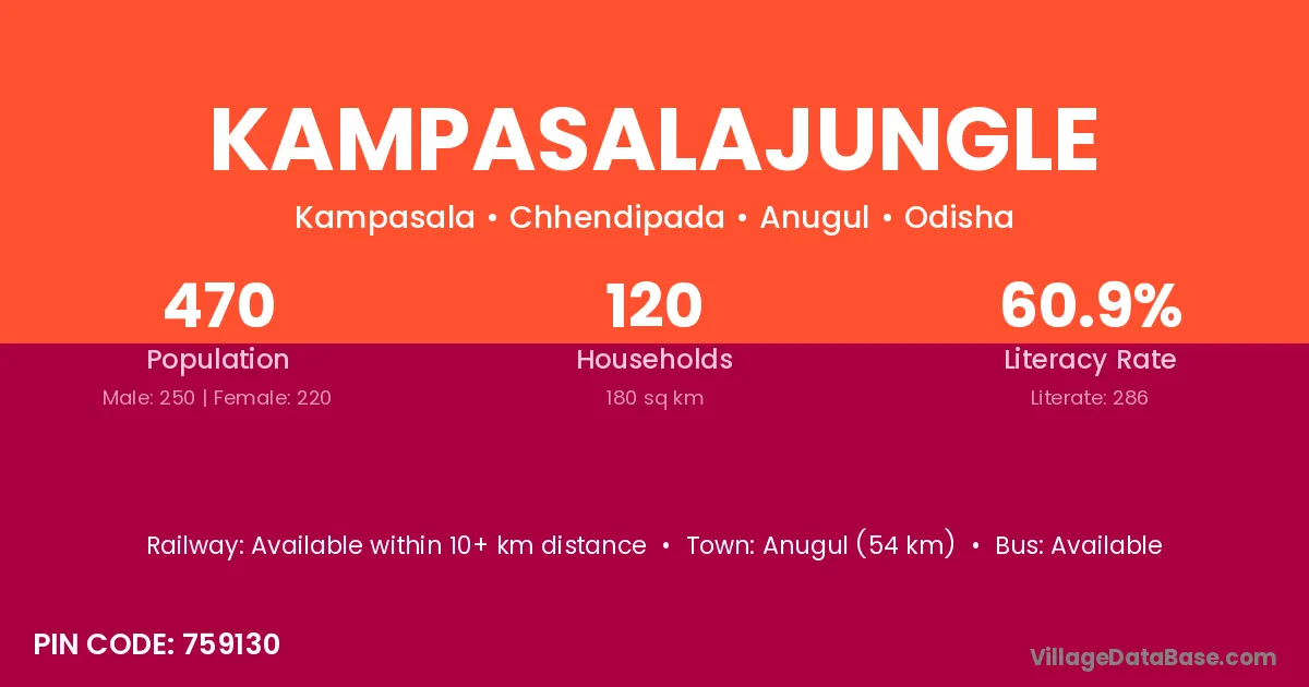 Anugul (54 km) is the nearest town to Kampasalajungle village for major economic activities and is located approximately 54 km away.