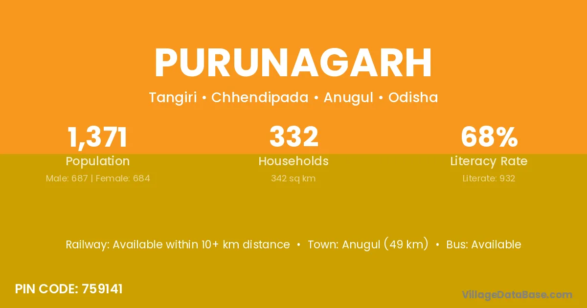 Anugul (49 km) is the nearest town to Purunagarh village for major economic activities and is located approximately 49 km away.