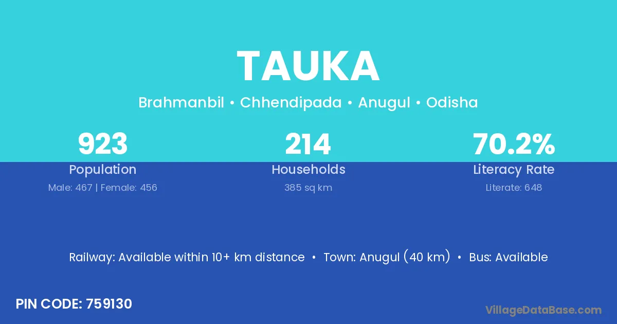 Anugul (40 km) is the nearest town to Tauka village for major economic activities and is located approximately 40 km away.