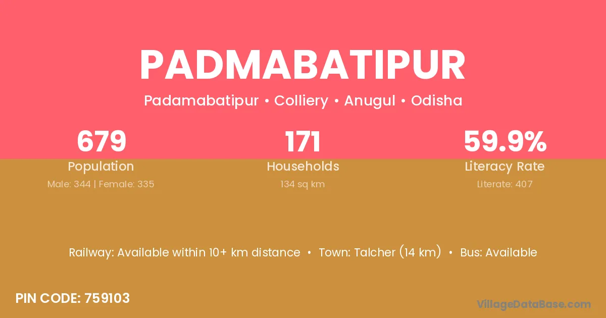 Talcher (14 km) is the nearest town to Padmabatipur village for major economic activities and is located approximately 14 km away.