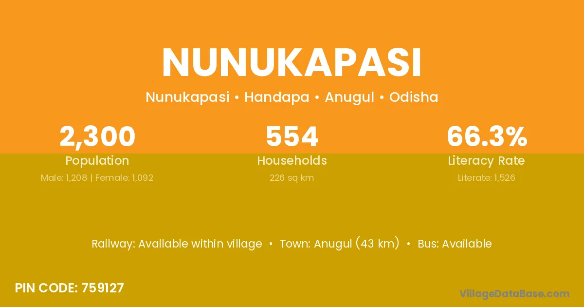 Anugul (43 km) is the nearest town to Nunukapasi village for major economic activities and is located approximately 43 km away.