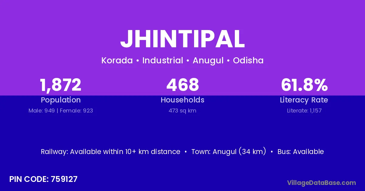 Anugul (34 km) is the nearest town to Jhintipal village for major economic activities and is located approximately 34 km away.