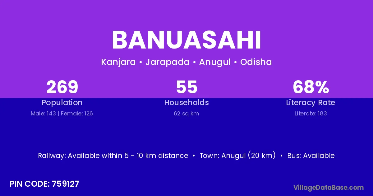 Anugul (20 km) is the nearest town to Banuasahi village for major economic activities and is located approximately 20 km away.