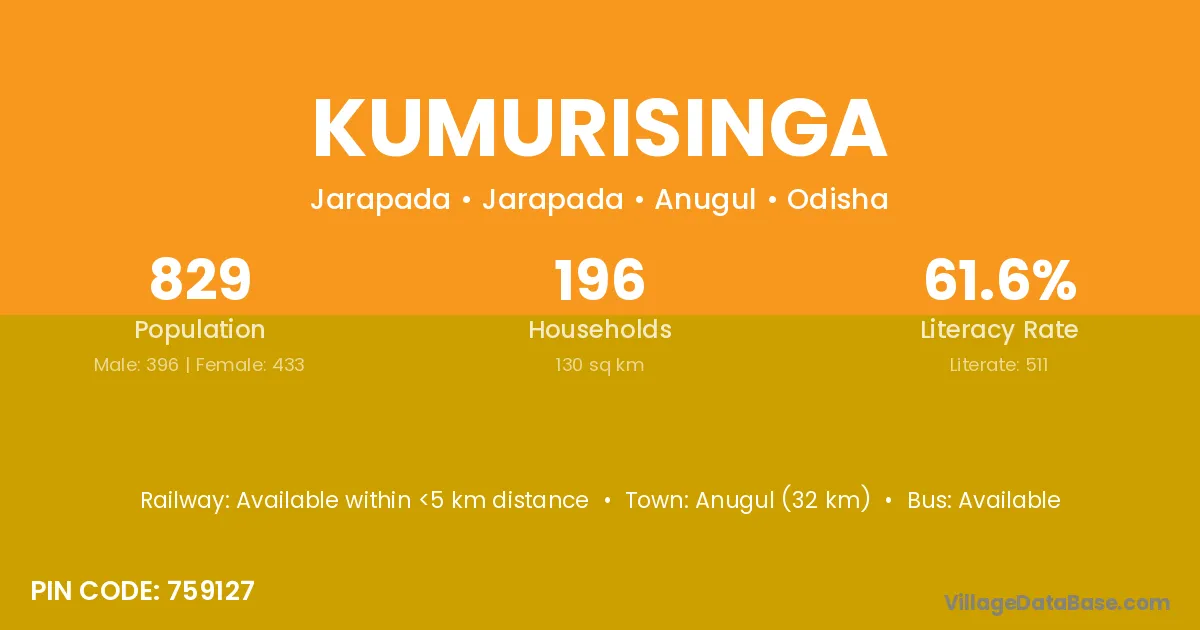 Anugul (32 km) is the nearest town to Kumurisinga village for major economic activities and is located approximately 32 km away.
