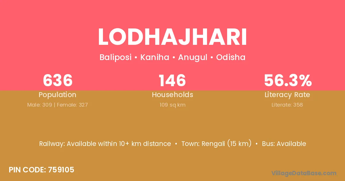 Rengali (15 km) is the nearest town to Lodhajhari village for major economic activities and is located approximately 15 km away.