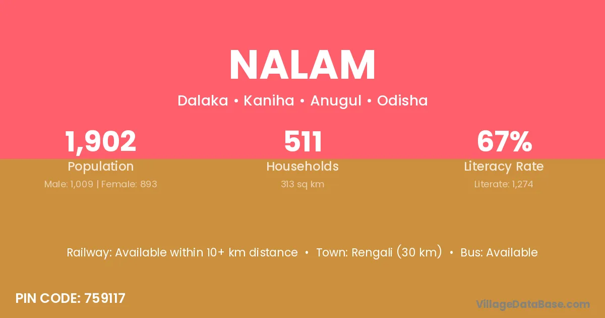 Rengali (30 km) is the nearest town to Nalam village for major economic activities and is located approximately 30 km away.