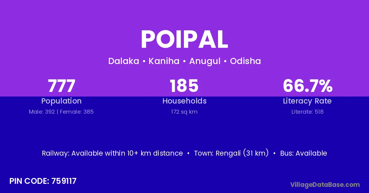 Rengali (31 km) is the nearest town to Poipal village for major economic activities and is located approximately 31 km away.