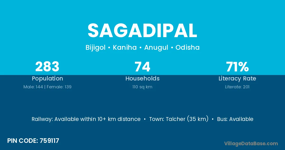 Talcher (35 km) is the nearest town to Sagadipal village for major economic activities and is located approximately 35 km away.