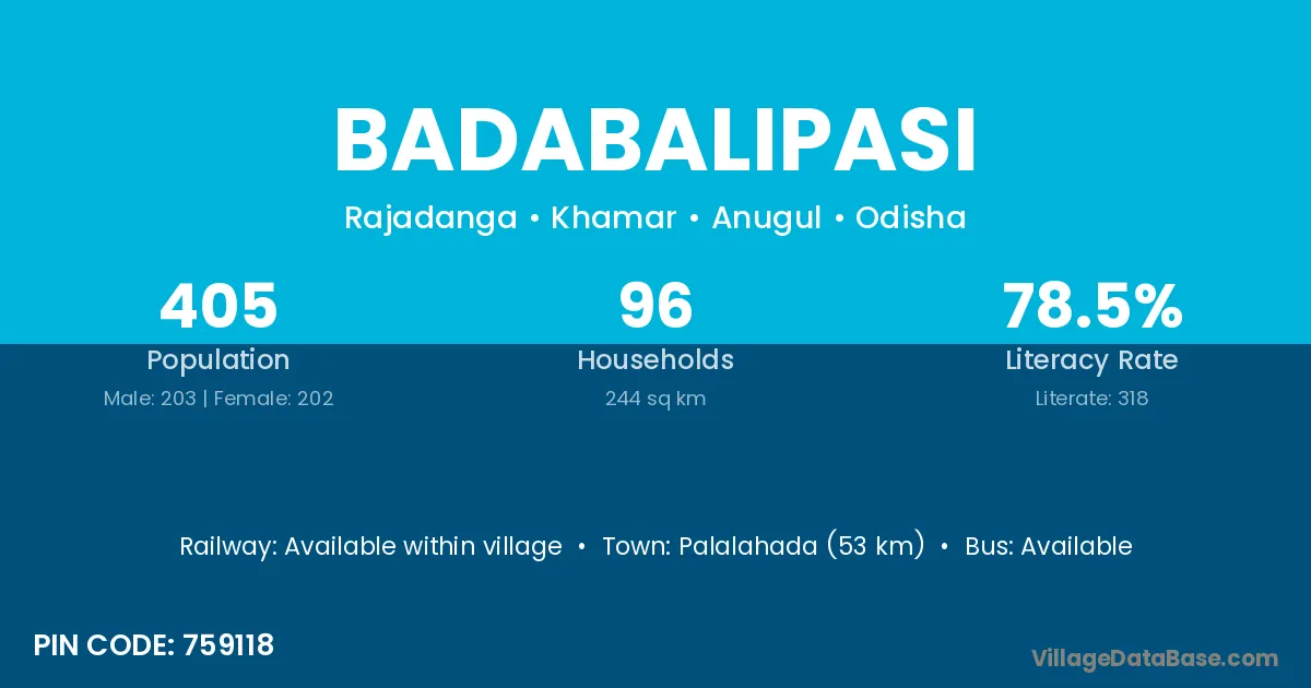 Badabalipasi village has a total population of 405 people, of which 203 are males and 202 are females.