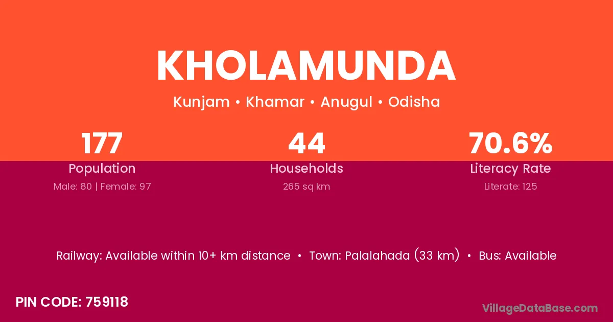 Kholamunda village has a total population of 177 people, of which 80 are males and 97 are females.