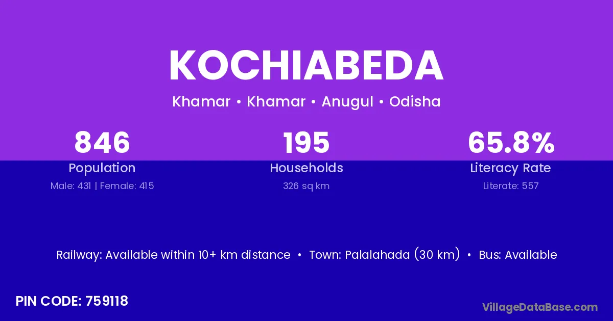 Kochiabeda village has a total population of 846 people, of which 431 are males and 415 are females.