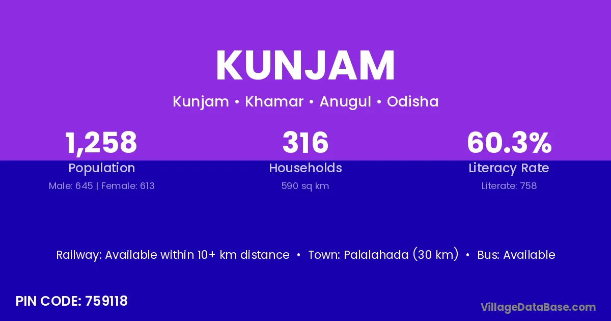 Kunjam village is located in the Khamar Tehsil of the Anugul district in Odisha .