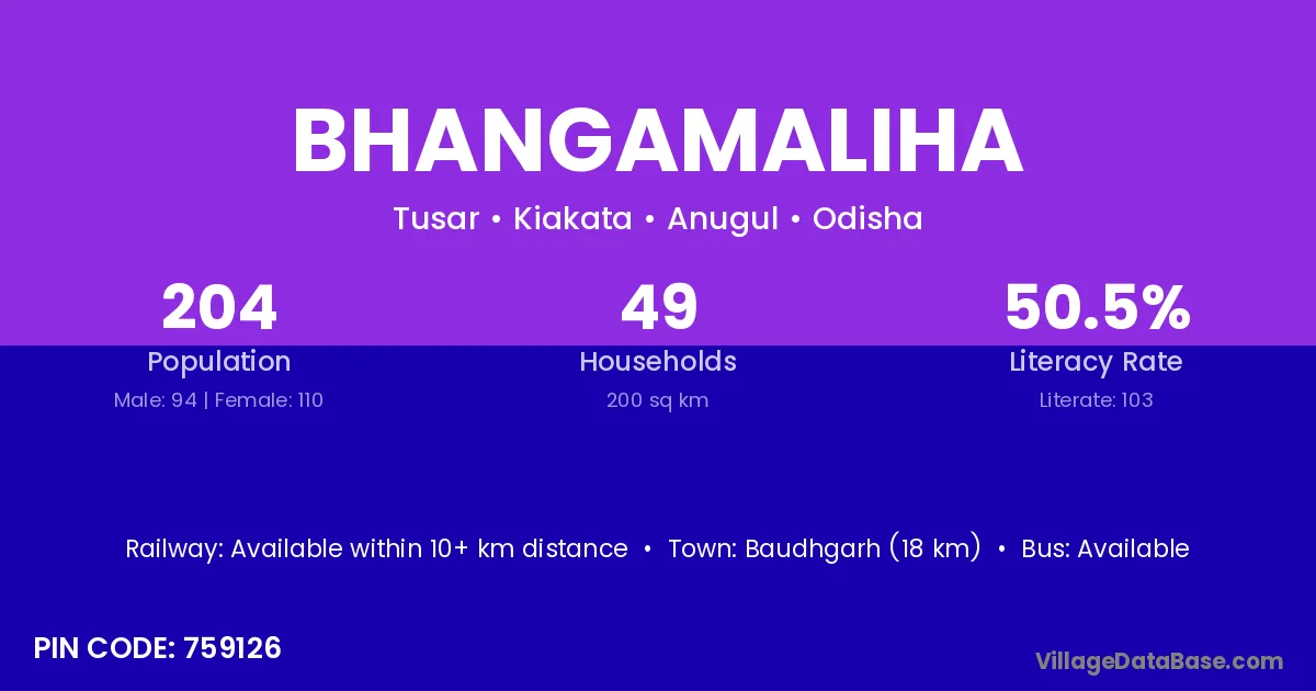 Bhangamaliha village has a total population of 204 people, of which 94 are males and 110 are females.