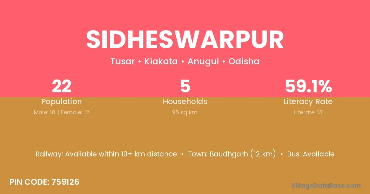 Sidheswarpur village has a total population of 22 people, of which 10 are males and 12 are females.