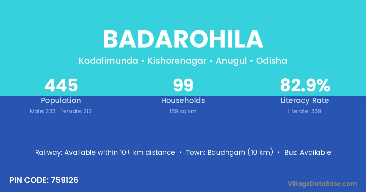 Badarohila village has a total population of 445 people, of which 233 are males and 212 are females.