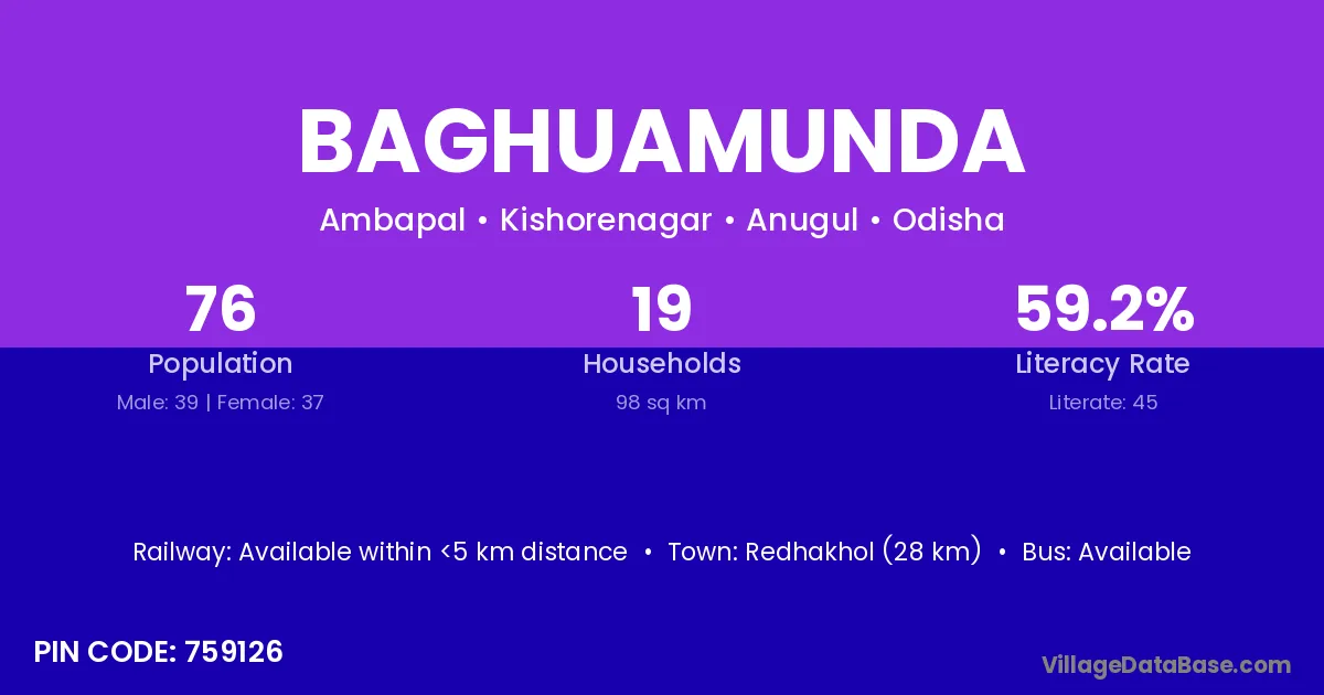 Redhakhol (28 km) is the nearest town to Baghuamunda village for major economic activities and is located approximately 28 km away.
