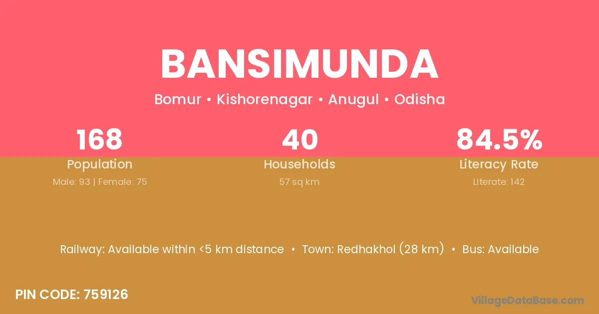 Bansimunda village has a total population of 168 people, of which 93 are males and 75 are females.