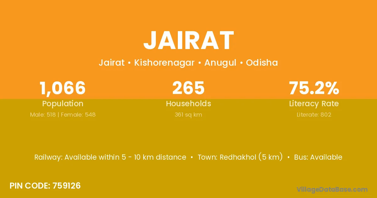 Redhakhol (5 km) is the nearest town to Jairat village for major economic activities and is located approximately 5 km away.