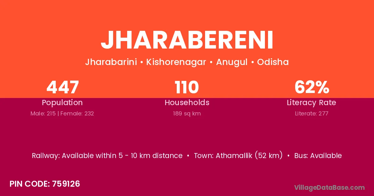 Athamallik (52 km) is the nearest town to Jharabereni village for major economic activities and is located approximately 52 km away.