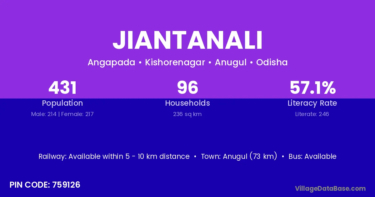Anugul (73 km) is the nearest town to Jiantanali village for major economic activities and is located approximately 73 km away.