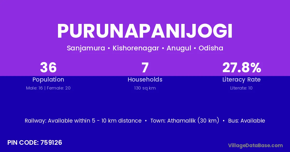 Athamallik (30 km) is the nearest town to Purunapanijogi village for major economic activities and is located approximately 30 km away.