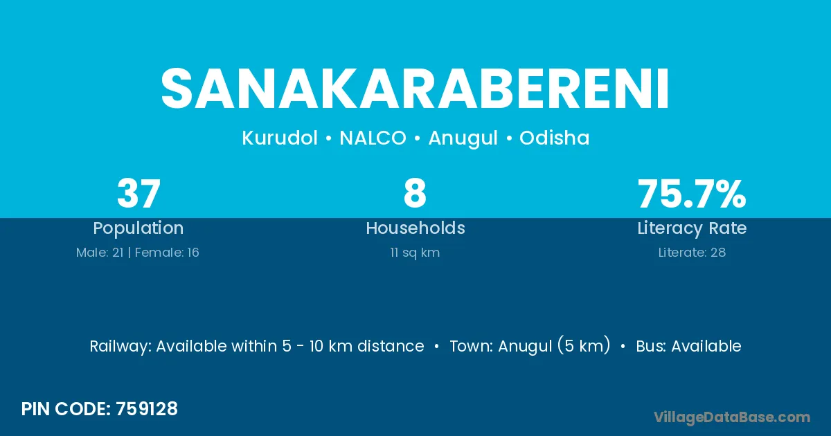 Anugul (5 km) is the nearest town to Sanakarabereni village for major economic activities and is located approximately 5 km away.