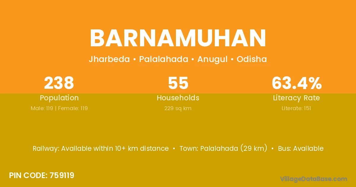 Barnamuhan village has a total population of 238 people, of which 119 are males and 119 are females.