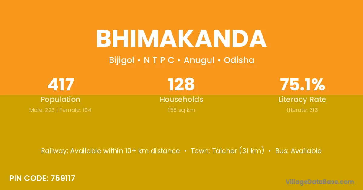 Palalahada (18 km) is the nearest town to Bhimakanda village for major economic activities and is located approximately 18 km away.