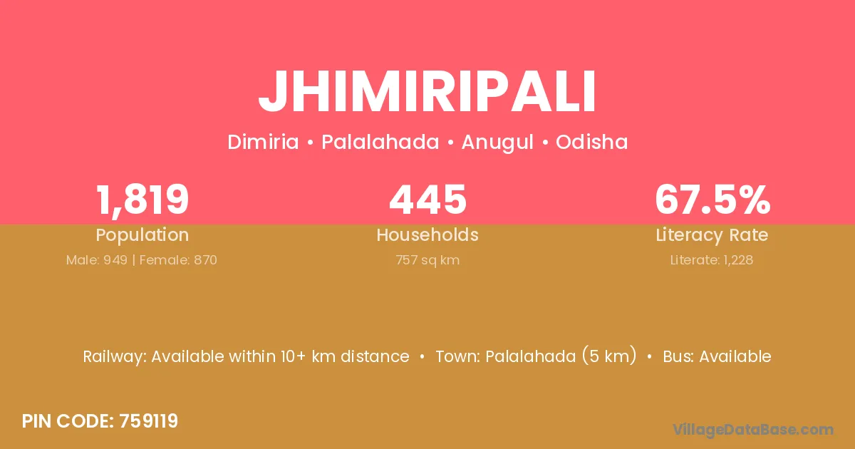 Palalahada (5 km) is the nearest town to Jhimiripali village for major economic activities and is located approximately 5 km away.