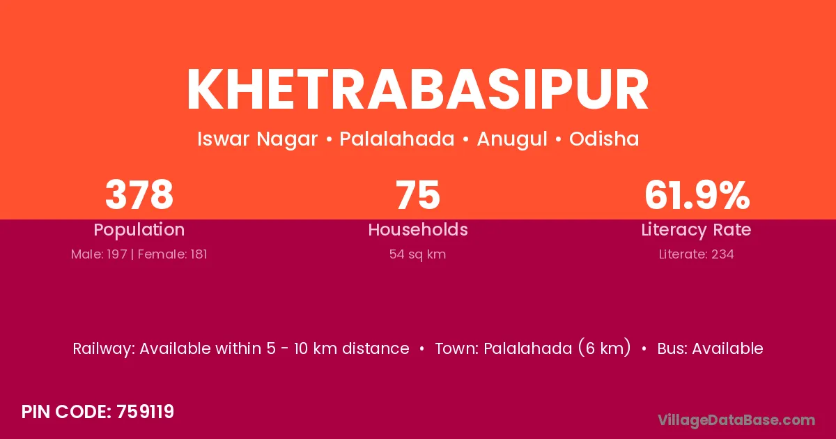 Palalahada (6 km) is the nearest town to Khetrabasipur village for major economic activities and is located approximately 6 km away.