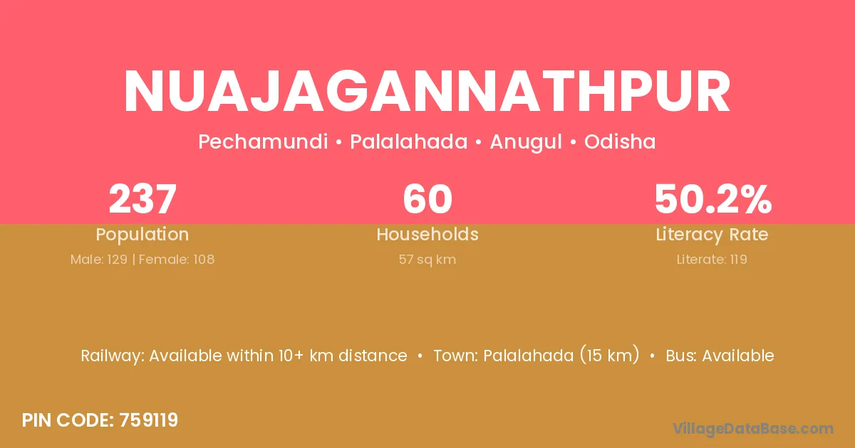Palalahada (15 km) is the nearest town to Nuajagannathpur village for major economic activities and is located approximately 15 km away.